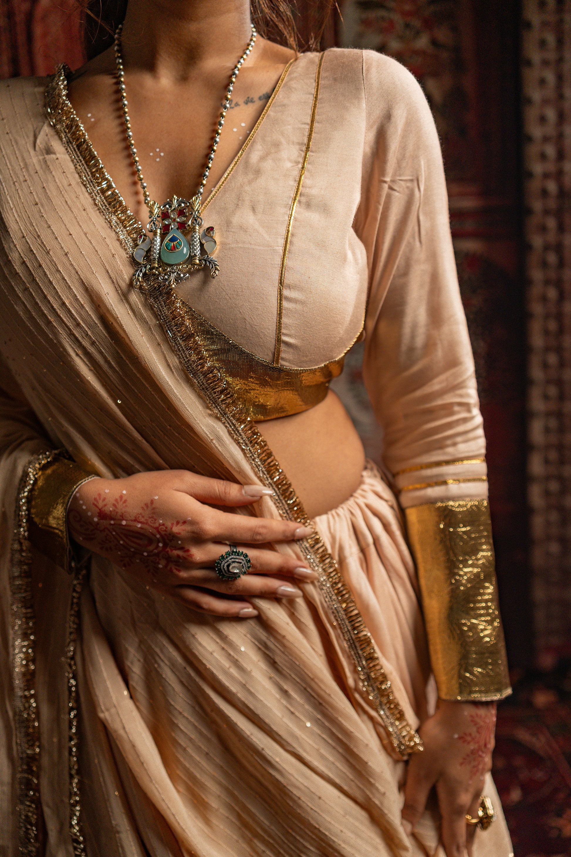 Elegant Beige Lampi Chaniya Choli Set perfect for traditional occasions. This beautiful three-piece set features breathable and comfortable fit. Fabric is muslin silk which gives the perfect shine and fall with 12 meters flare.