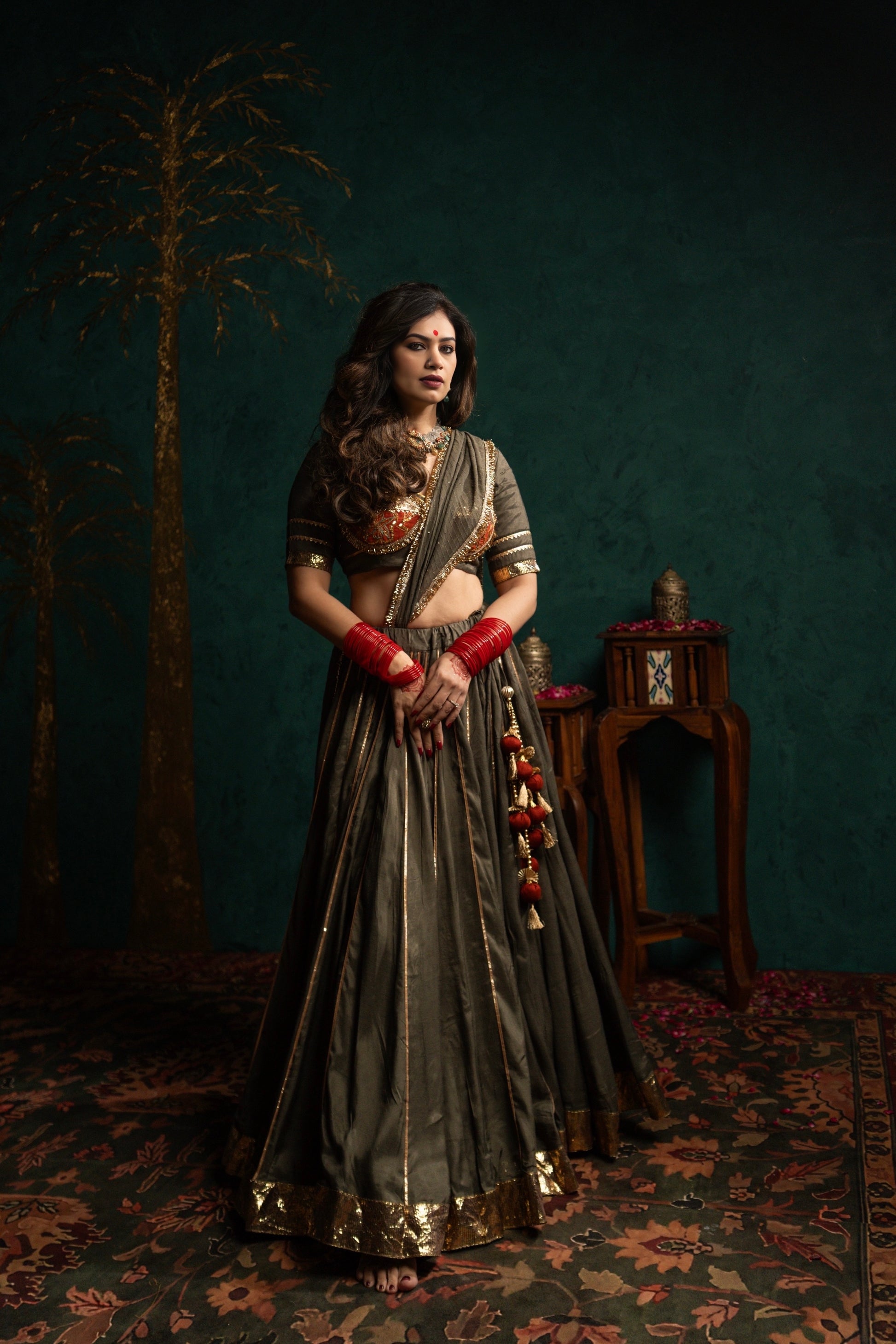 Elegant Grey Lampi Chaniya Choli Set perfect for traditional occasions. This beautiful three-piece set features intricate detailing and comfortable fit. Fabric is shantoon silk which gives the perfect shine and fall with 14meters flare.