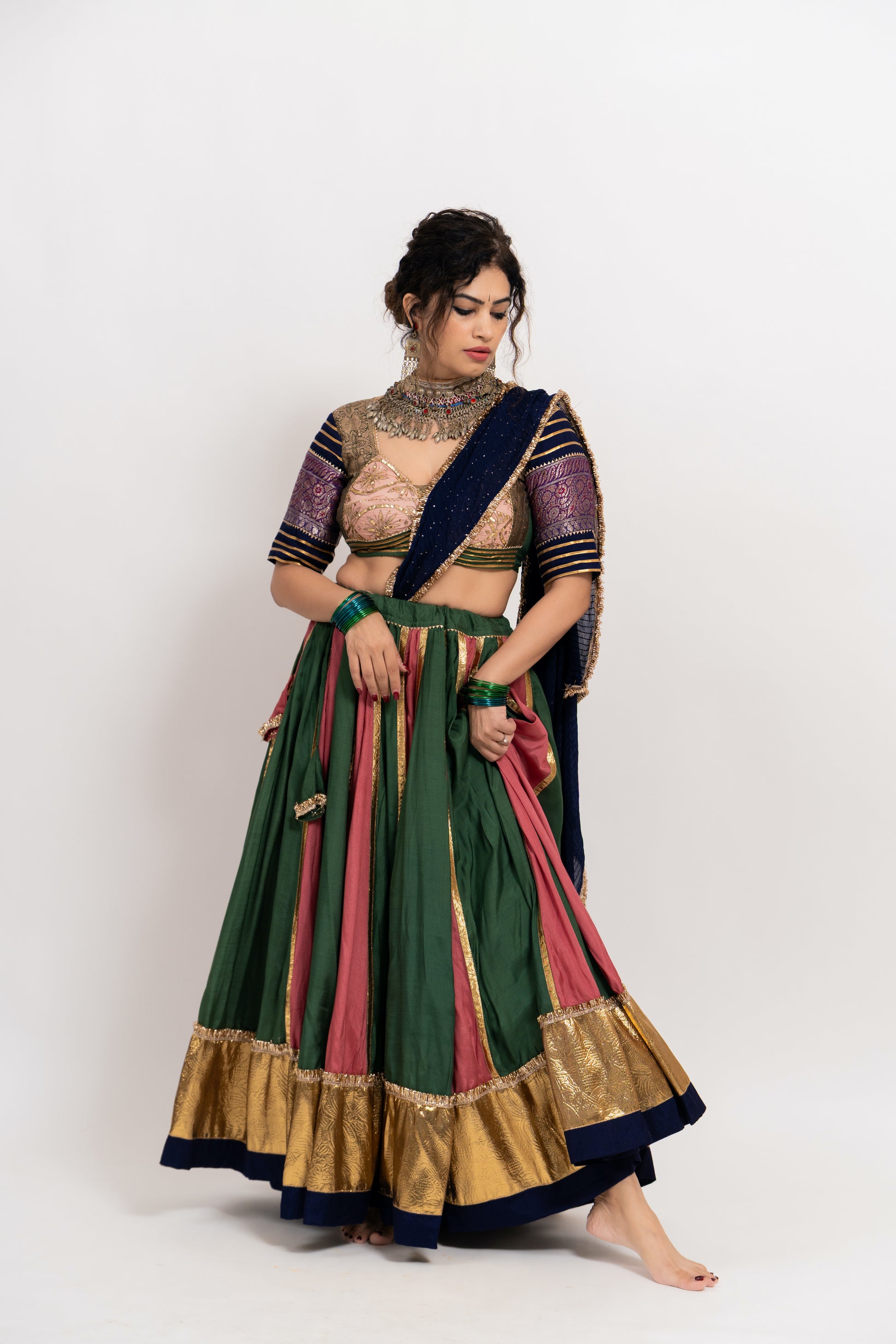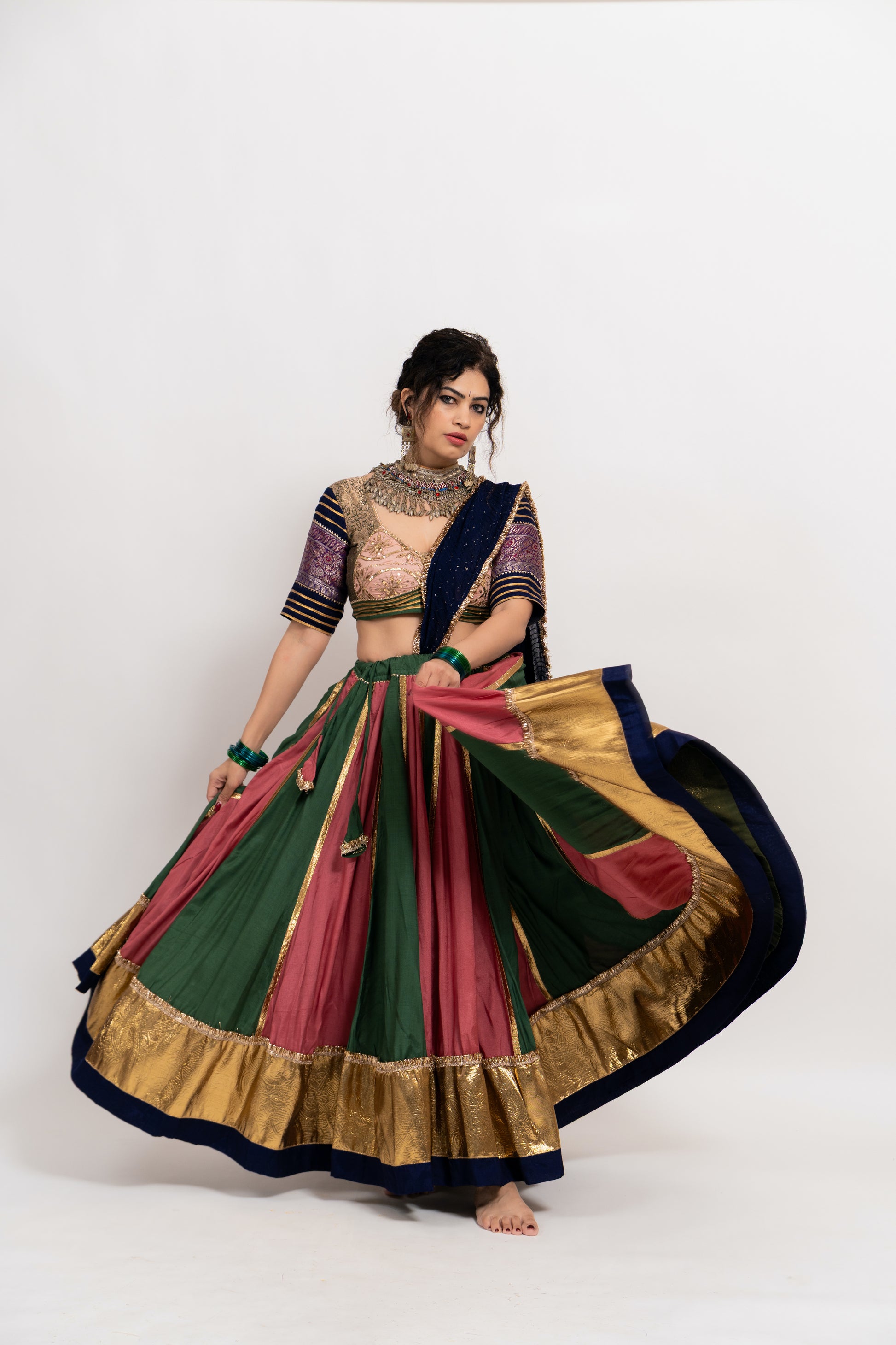 Multi green pink kalidar set with a beauitful katori blouse and 14m flared chaniya with muslin fabric and vintage katori on the blouse paired with georgette rani duppatta
