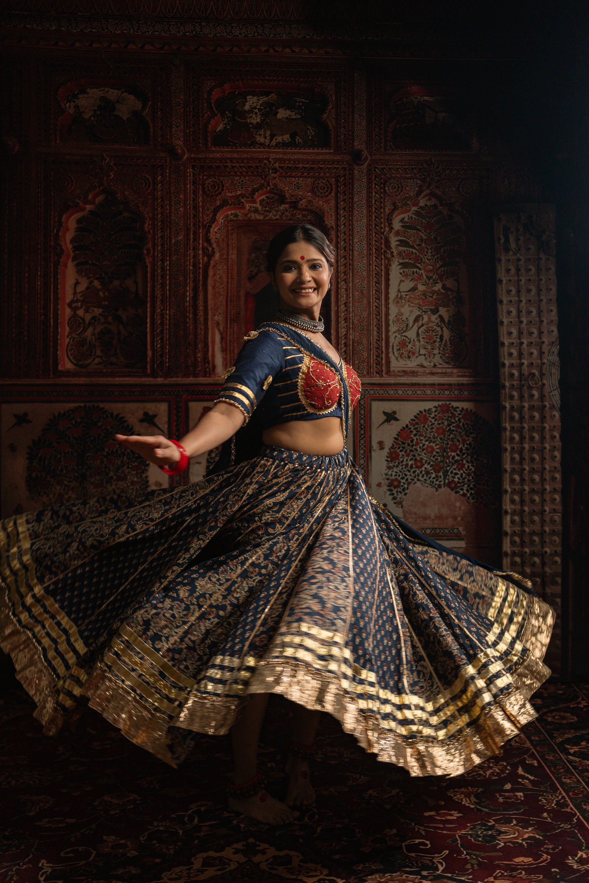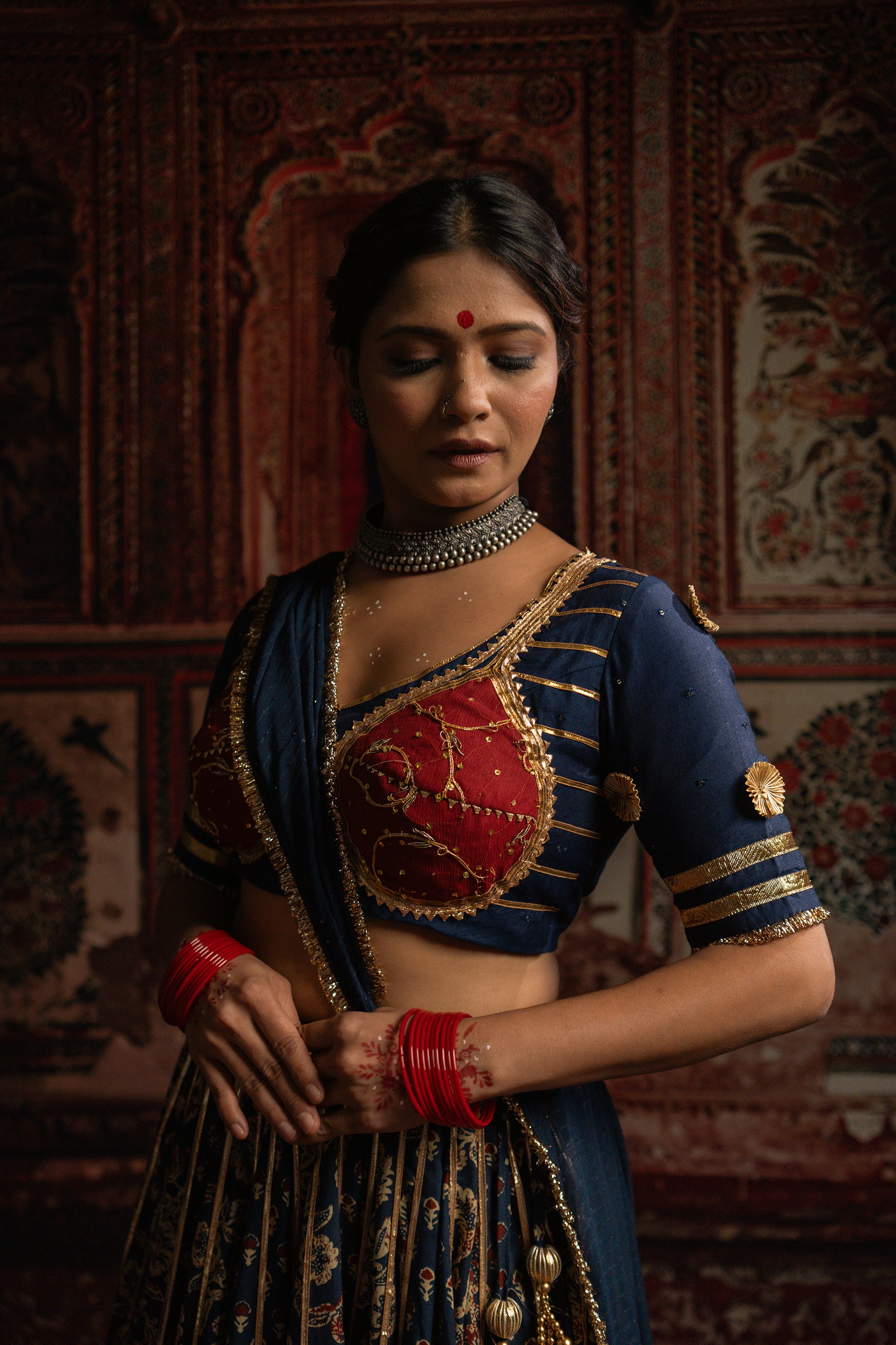This gamthi vegetable printed chaniya enhanced with the golden copper tui border , with pure rose gold lampi, the katori blouse with the vintage embroidered fabric giving the perfect contrast to the look.