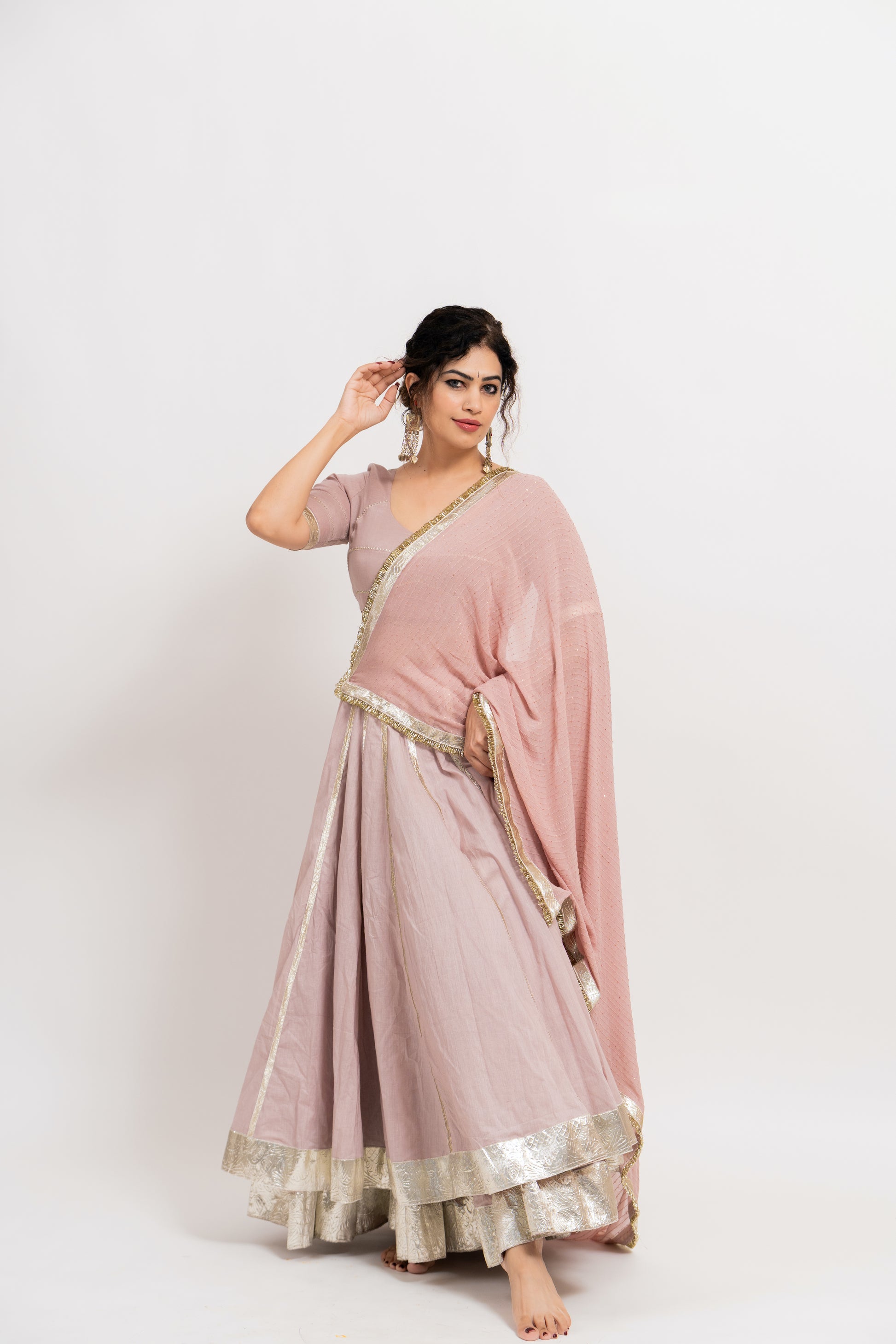 Pastel Mauve Chaniya Choli Set perfect for traditional occasions. This beautiful double layered chaniya, three-piece set features gradation of golden borders & comfortable fit. Fabric is mul cotton for a comfortable garba night and a flare with 14meters flare.